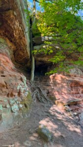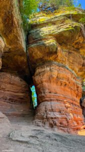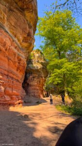 Imagine un immense mur de pierre rouge, sculpté par le vent, la pluie et le temps. Un chaos rocheux aux reflets ocre, ponctué d’arches naturelles, de cavités mystérieuses et de tours de grès rose qui semblent sortir tout droit d’un western… sauf que tu n’es pas aux États-Unis, mais à Roppeviller, en Moselle, juste à la frontière franco-allemande, dans le Parc naturel régional des Vosges du Nord.