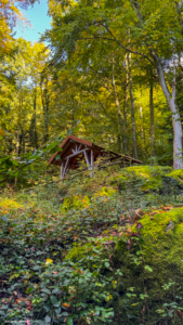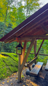 En haut de la montée, après environ 25 à 30 minutes, tu arrives à un abri couvert en bois. C’est le point de pause parfait : bancs, toit, silence, et le bruit de l’eau juste à côté. Tu peux t’y poser, pique-niquer, ou simplement profiter du calme.