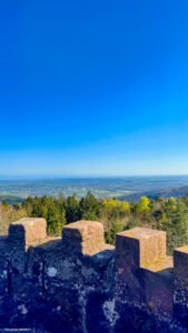 La première tour en bois date de 1889 (merci le Club Vosgien !), mais celle que tu peux admirer aujourd’hui a été construite en 1909, tout en grès des Vosges. Haute de 25 mètres, elle est équipée d’un escalier en colimaçon de 128 marches. Une fois en haut, tu profites d’une vue à 360° sur la plaine d’Alsace, les crêtes vosgiennes, le Palatinat allemand et même, par temps clair, la cathédrale de Strasbourg. Rien que ça.